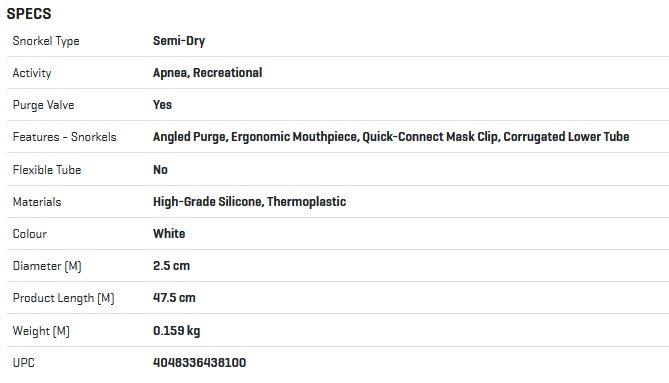 Escapes stænkbeskyttelsesdesign i toppen hjælper med at forhindre vand i at trænge ind i den store tønde, samtidig med at den tillader rigelig luftgennemstrømning. Denne brugervenlige snorkel inkluderer en meget effektiv udluftningsventil placeret lavt, et ultrakomfortabelt mundstykke i regulatorstil og en praktisk klips til hurtig afmontering fra din maskerem.
