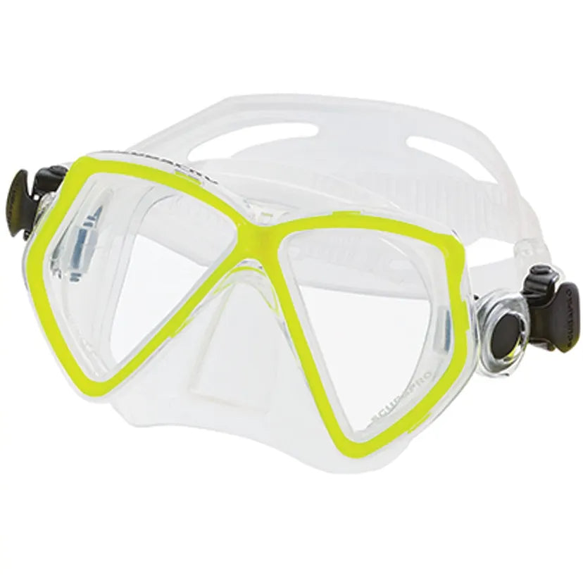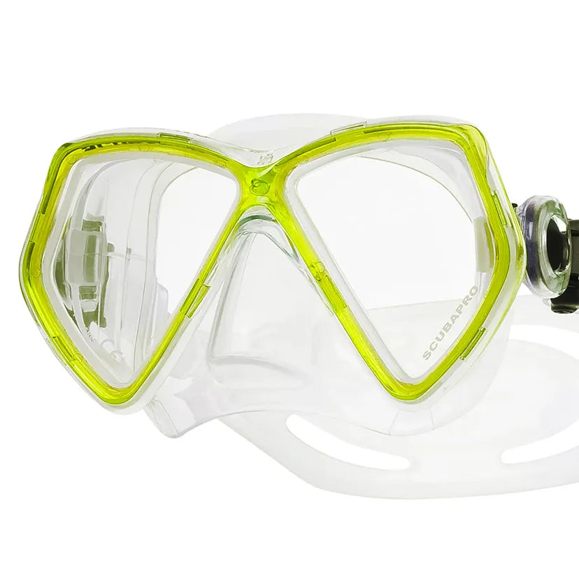 Denne maske med dobbelte linser er designet til børn og mindre dykkere eller alle med et lille ansigt.